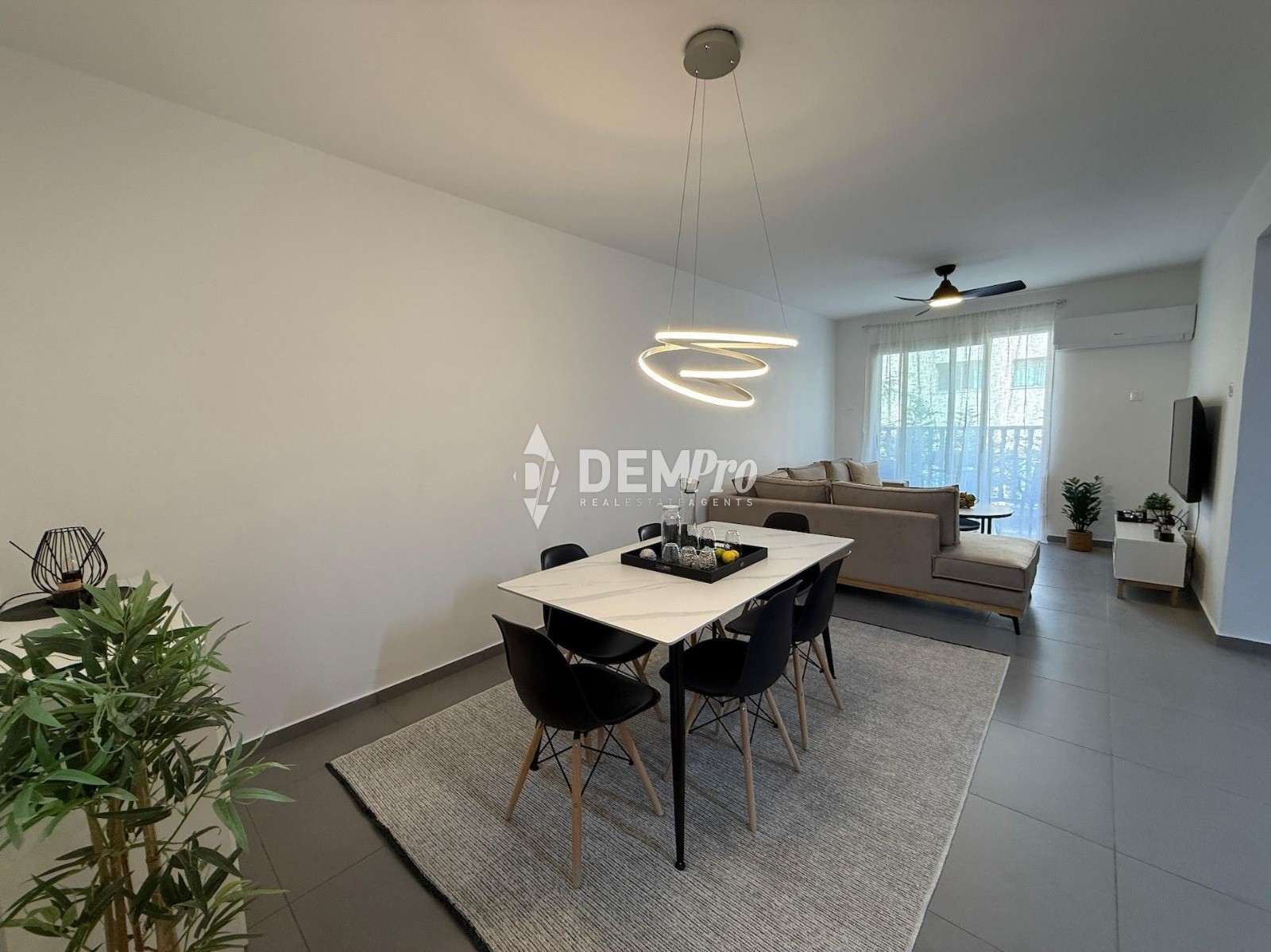An elegant open-plan living area, tastefully furnished, seamlessly flows into a fully equipped kitchen — ideal for both relaxing and entertaining.
