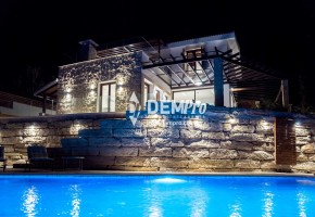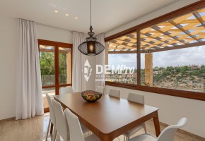 This delightful property is a newly completed detached villa on the East Plateau at Aphrodite Hills. The villa has four bedrooms and five bath/shower rooms and with so many additional features would make an extremely popular rental property. The villa, which is on a tiered plot, over looks the central ravine of the Resort with sea and sunset views to the side. The property has a generous front garden and ample parking for several cars with sensor lighting.
