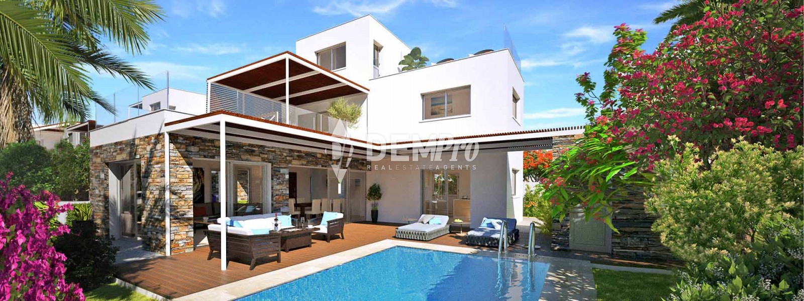 Aquamarine Coastal Villas, Villa No. 5 is a modern design 3 bedroom villa for sale, located in the heart of the tourist area of Paphos in Cyprus. The villa is designed in a large plot and enjoys a private swimming pool with spacious outdoor areas. The villa is located in front of one of the most famous sandy beaches in Paphos and enjoys easy access to a variety of restaurants, pubs, bars 5-star beach resorts and other amenities.