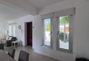 Upon entering the villa, you are greeted by a bright and inviting open-plan living and dining area, with a staircase ahead leading to the upper level. Just past the dining area, a hallway leads to a spacious double bedroom on the ground floor with a double bed and a nearby full bathroom, ideal for guests or convenient single-level living.